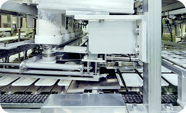 充填用ホッパーの下にある6台の計量装置で浸漬米を計り、製造ラインに流れてくる容器の中に充填します。この後、ウェイトチェッカーで重量が確認されます。浸漬米が投入された容器は、横列6食×縦列4食=24食ごとに搬送カセットに乗せられて、次の工程に進みます。